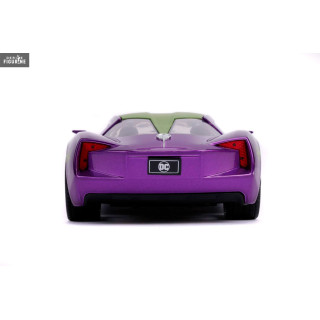 Figurines officielles + véhicule au choix entre Harley Quinn ou Joker en die cast et plastique injecté, à l'échelle 1/24. Le fabricant est Jada Toys.