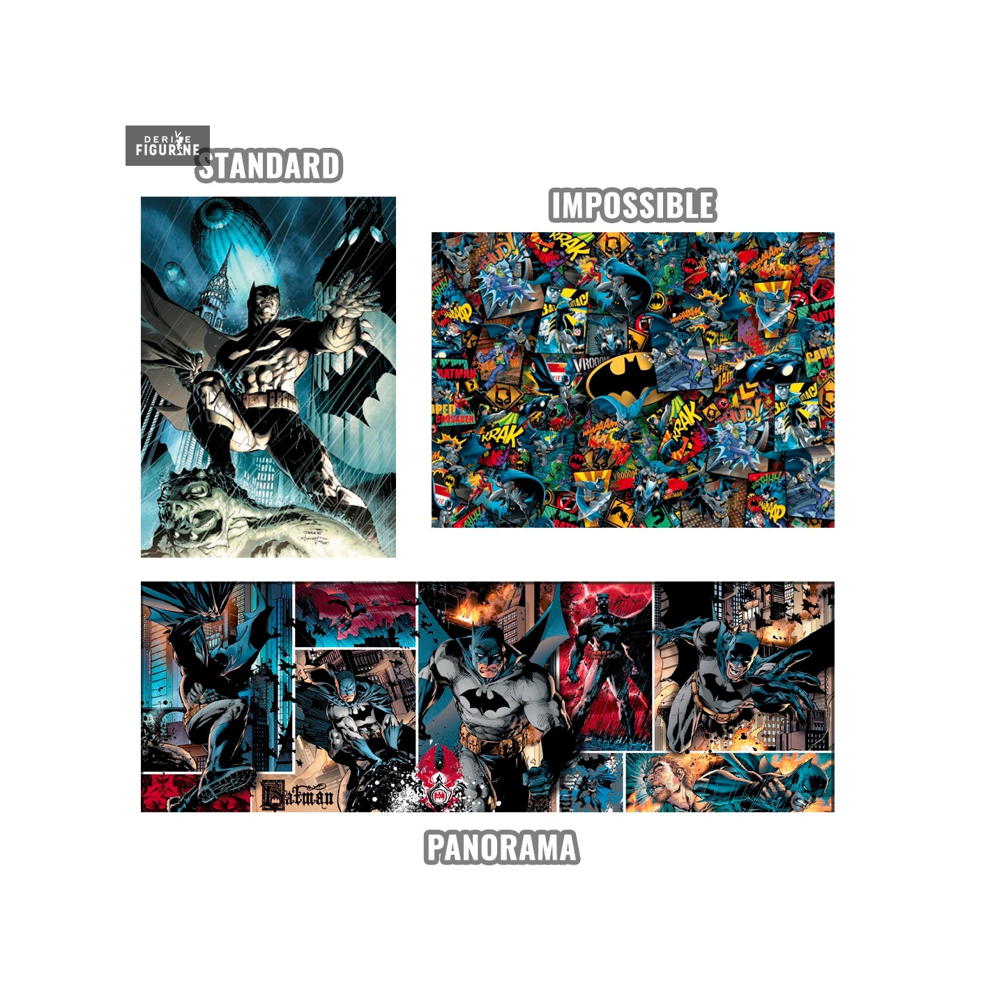 Vous avez le choix entre trois magnifiques puzzles DC Comics Batman de 1 000 pièces ! Le modèle Standard nous offre un Batman plus ténébreux et classe que jamais où l'on peut le voir en haut d'un immeuble avec en fond, le batsignal et un aéronef de Gotham City. La version Impossible opte pour un nombre incalculable de scènes tirées des comics et enfin, le Panorama part lui aussi dans le style des Bds mais se concentre principalement sur Batman pendant l'une de ses missions.