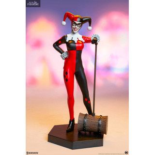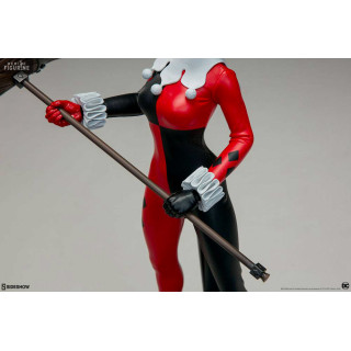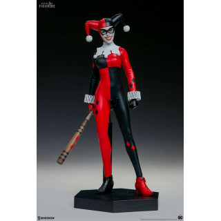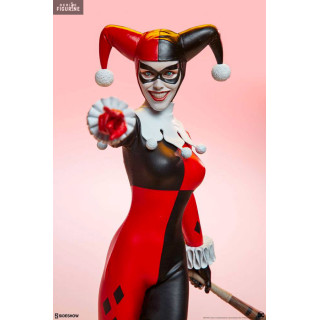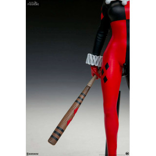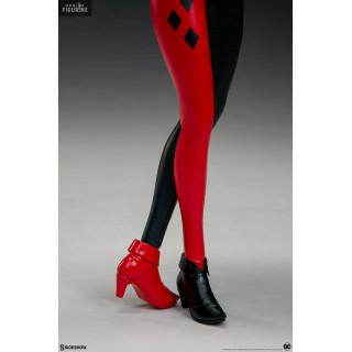 Figurine officielle de Harley Quinn mesurant environ 28 centimètres de haut, à l'échelle 1/6. Le fabricant est Sideshow Collectibles.