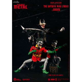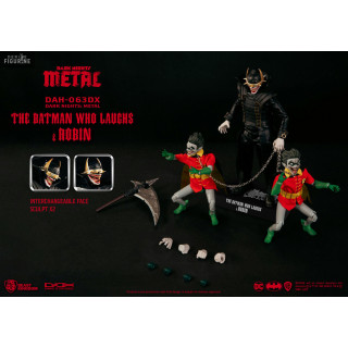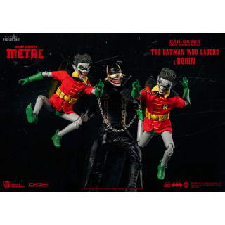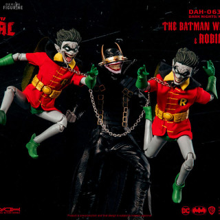 Il existe plusieurs Terre parallèles, avec les mêmes personnes qui y vivent, mais dont les destins sont un peu différents en fonction des choix qu'ils feront dans leur vie. Ici, vous êtes face à Batman de la Terre-22 et on peut dire que Bruce Wayne n'a pas vraiment bien encaissé la mort de ses parents. Vous pouvez donc le voir sous des traits qui rappellent ceux du Joker, et en guise de chiens, il a deux Robins qui sont également enragés. Leurs vêtements sont en tissu, et ils possèdent des articulations pour les exposer comme bon vous semble. De plus, Batman a des visages interchangeables.