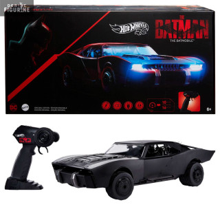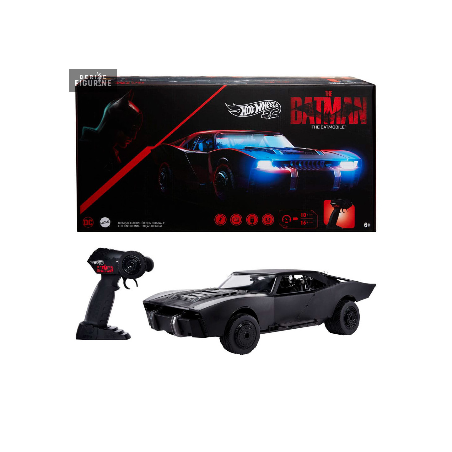 Batmobile radiocommandée officielle mesurant environ 50x24x13 centimètres, à l'échelle 1/10. Le fabricant est Mattel (Hot Wheels).