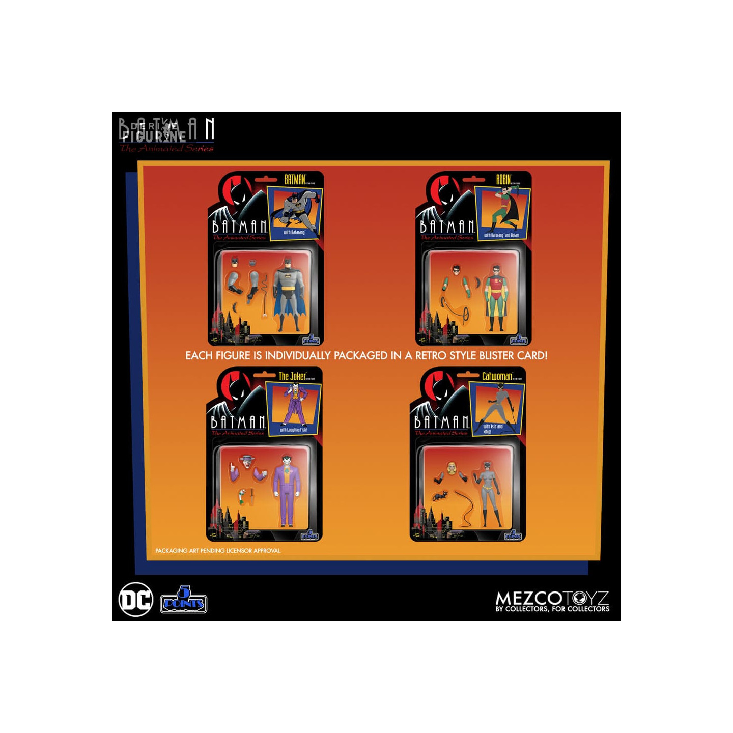 Figurines officielles de Catwoman, Batman, Robin et Joker mesurant environ 9 centimètres de haut. Elles sont issues de la collection 5 Points. Le fabricant est Mezco Toys.
