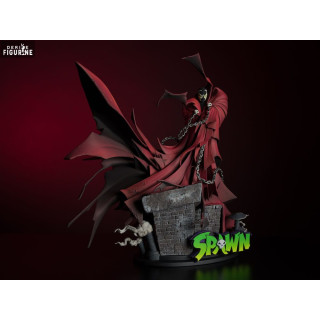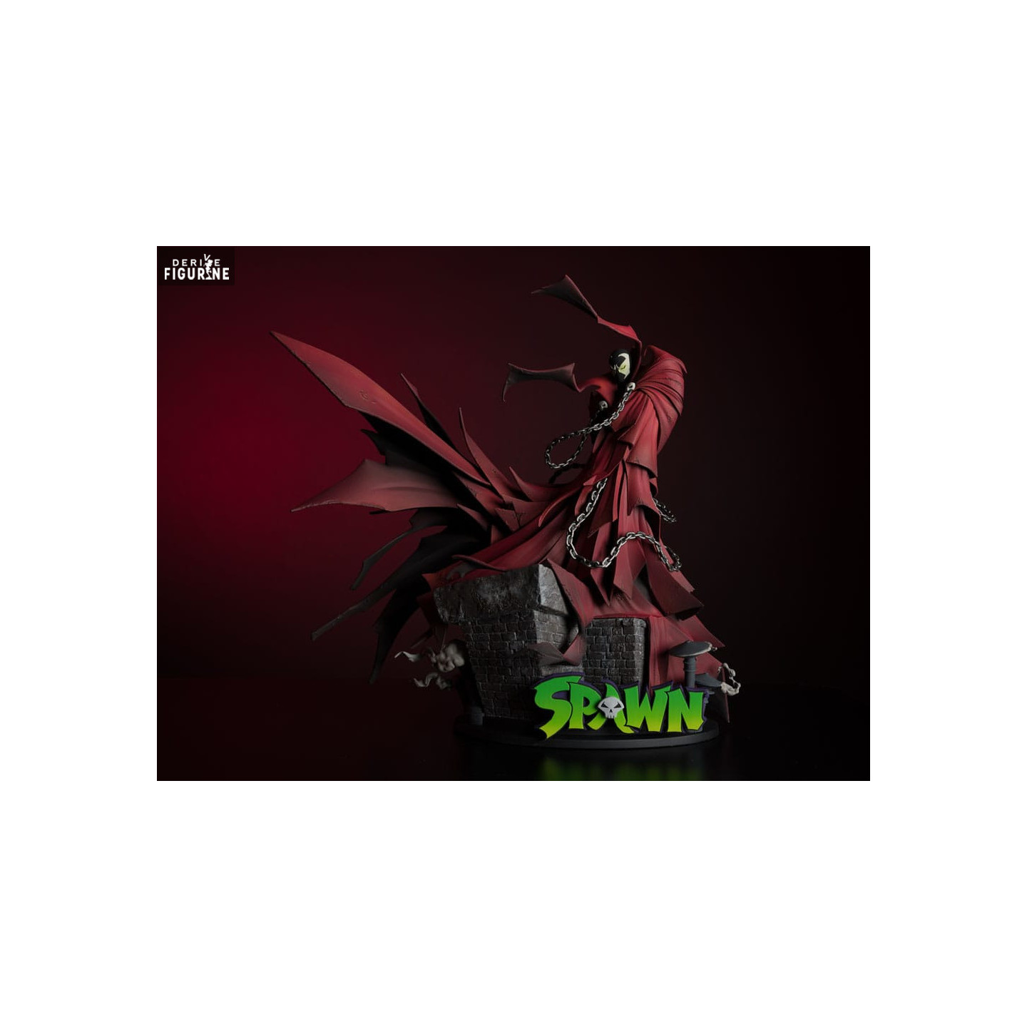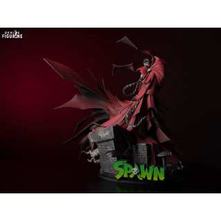 La base de la figurine, représentant une scène urbaine délabrée, est riche en détails. Les textures des briques, les débris et les éléments de fumée qui s'échappent des cheminées sont minutieusement réalisés, offrant un cadre immersif qui transporte les fans directement dans le monde de Spawn. Le logo vert éclatant de Spawn ajoute une touche finale percutante, contrastant avec les tons sombres de la figurine.