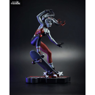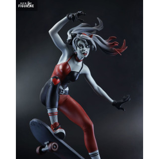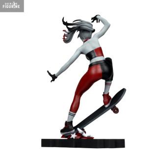 Dans cette version, Harley Quinn est représentée sur un skateboard, effectuant une figure acrobatique, une posture qui reflète son esprit libre et imprévisible. Sa tenue rouge et noire, signature classique de Harley, a été revisitée dans un design moderne et stylisé par Ivan Tao, avec des lignes épurées et un contraste frappant. Sa pose dynamique et ses expressions faciales sont parfaitement réalisées, capturant l'essence de la folie et de la malice qui définissent Harley.