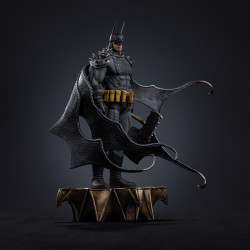 Sur cette pièce, on retrouve Batman debout, droit et ancré dans le sol, dans un costume gris anthracite moulant, complété par des gants, bottes et cape noirs. Une large ceinture utilitaire jaune, segmentée en multiples compartiments, fait le tour de sa taille et tranche avec le reste de la tenue. Ses épaules sont protégées par une armure sombre hérissée de pics, et son masque, aux longues oreilles pointues, laisse apparaître un bas du visage fermé, concentré. La cape est l’élément le plus spectaculaire : texturée, elle s’ouvre de chaque côté en grandes formes découpées qui ondulent et se terminent en pointes recourbées, comme si elle suivait un courant de vent. Le tout repose sur un socle géométrique de couleur bronze, composé de pans triangulaires rappelant un symbole de chauve-souris stylisé, qui donne à l’ensemble une allure de pièce de collection bien marquée.