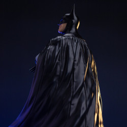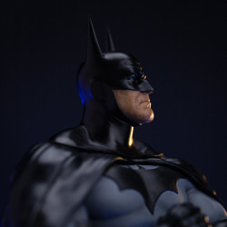 Visuellement, la statue montre Batman debout, le buste droit et les bras croisés, avec une expression fermée sous son masque à longues oreilles. Son costume alterne gris sombre et noir, avec une ceinture utilitaire dorée et des bottes massives, tandis que l’emblème de chauve-souris se devine sur la poitrine. La cape noire est l’élément le plus spectaculaire: elle s’enroule et s’étire en grandes vagues, comme prise dans un vent violent, et encadre la silhouette en formant une masse d’ombre autour de lui. La base évoque un sommet de bâtiment, avec des volumes de pierre et une forme de gargouille, renforçant l’idée d’un Batman perché au-dessus de la ville.