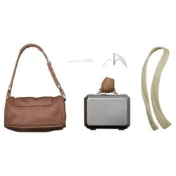 Visuellement, il est représenté debout, en tenue de ville : long manteau camel ouvert, écharpe crème autour du cou, costume noir avec chemise claire et cravate sombre. Il porte des lunettes de soleil et a les cheveux noirs coiffés en arrière. Une sacoche marron est passée à l’épaule, et il tient une valise grise rigide à la main, avec des chaussures marron. La pose est droite et stable, parfaite pour une mise en scène “Gotham en déplacement” sur une étagère.