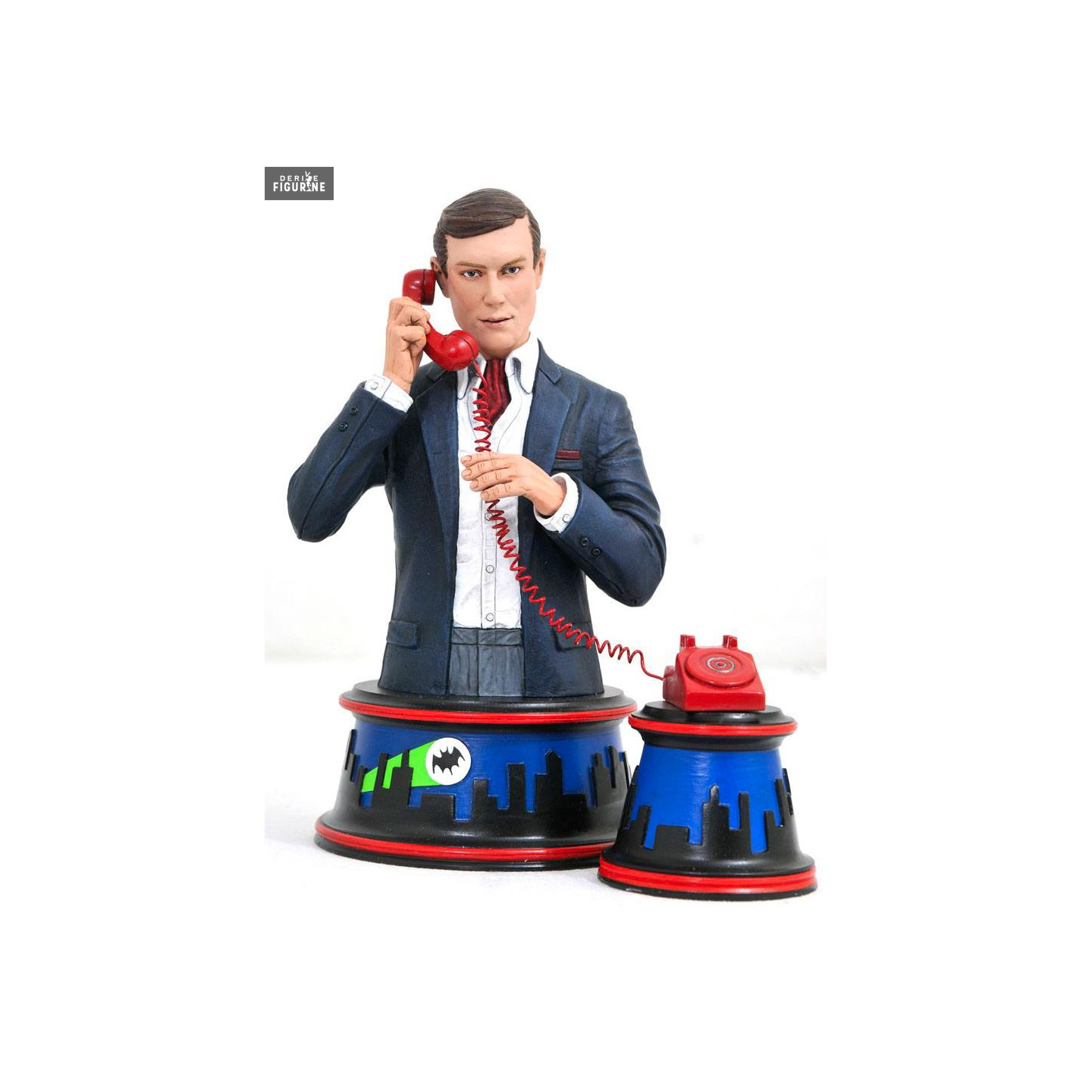 Si nous avons plus souvent l'habitude de le voir dans le costume de Batman, c'est ici Bruce Wayne que nous avons sur ce buste. Il tient le téléphone rouge qui sert justement à Batman, et il n'est pas sans rappeler la fameuse scène où, par le biais du chef O'Hara et de Gordon, Batman se voit obligé de se parler à lui-même.
