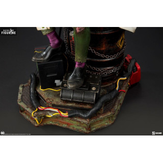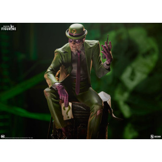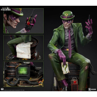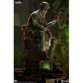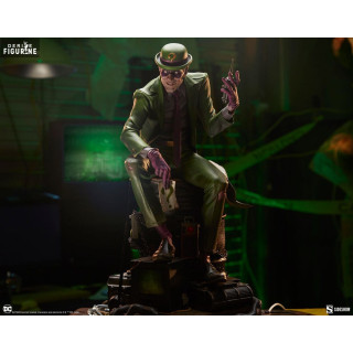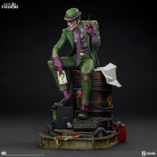Cette figurine Premium Format de Riddler, créée par Sideshow Collectibles, capture avec précision son essence rusée et menaçante. Mesurant environ 49 centimètres, elle le représente assis sur un baril délabré, entouré d’équipements électroniques, et tenant une carte et une télécommande, prêt à déclencher ses plans diaboliques. Les détails exquis de son costume vert usé, de ses gants violets et de sa canne emblématique montrent un soin méticuleux dans la conception. L’ensemble de la scène, avec ses couleurs sombres et ses textures réalistes, reflète l’atmosphère mystérieuse et tendue de Gotham.