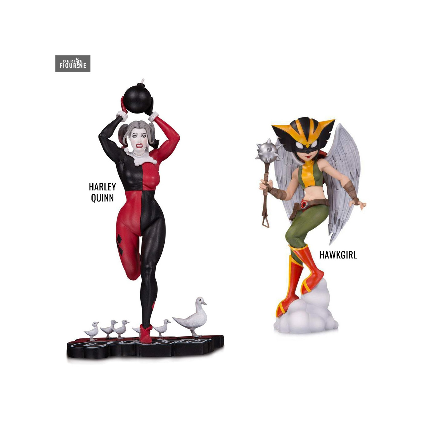 Figurine officielle au choix de Harley Quinn (Red, White & Black Frank Cho 21 cm) ou Hawkgirl (DC Artists Alley Zullo 18 cm) en résine. Le fabricant est DC Collectibles.