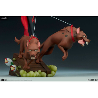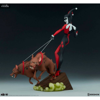 La plus belle des bouffons rouges et noirs est de retour dans une nouvelle statuette. Notre chère Harley Quinn est donc dans la version de la série animée et c'est l'heure de la promenade pour ses deux hyènes. Oui, en temps normal c'est plutôt des chiens que l'on tient en laisse, mais chacun ses goûts... Petit détails assez amusant, si vous regardez bien, vous pourrez voir deux poissons qui ont un petit air de ressemblance avec le Joker.
