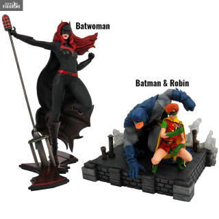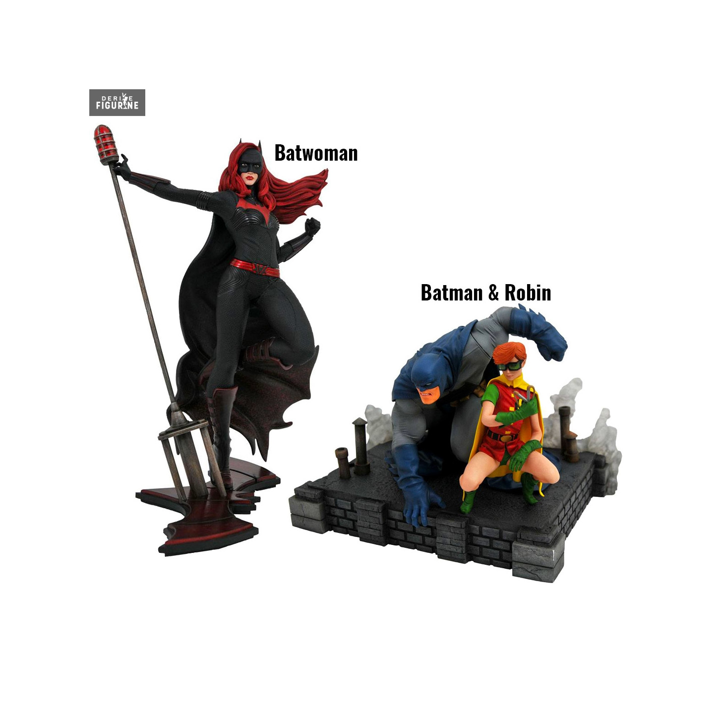 Figurine officielle de Batwoman (TV) (~23 cm) ou Batman & Robin (The Dark Knight Returns) (~20 cm) en PVC. Le fabricant est Diamond Select Toys.
