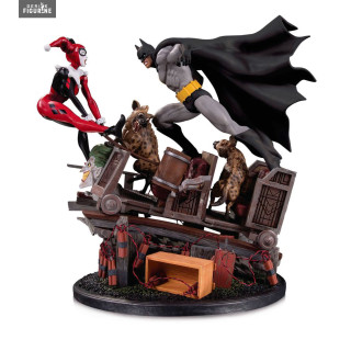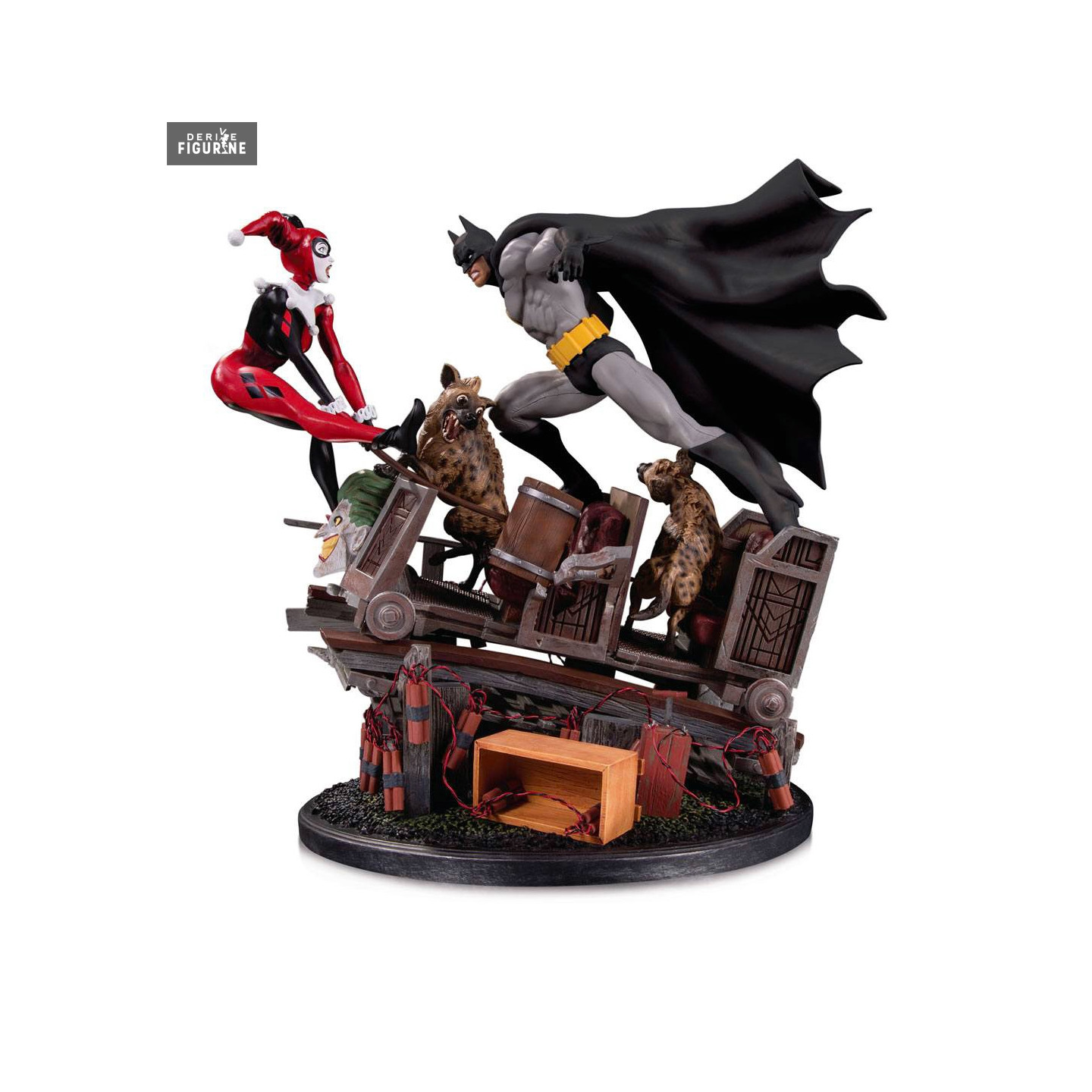 Il n'est pas rare que Batman et Harley Quinn se retrouvent dans des face à face, mais celui-ci est assez sportif. En effet, ils semblent être sur un wagon de montagne russe avec deux hyènes de notre jolie bouffon rouge et noir, ainsi que de nombreux bâtons de dynamites. A noter qu'il n'y a que 5 000 exemplaires numérotés de cette statuette.