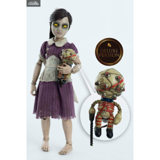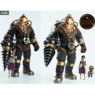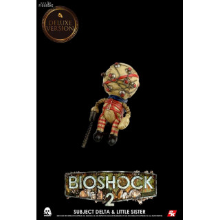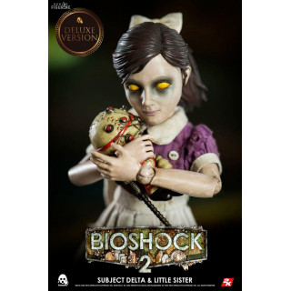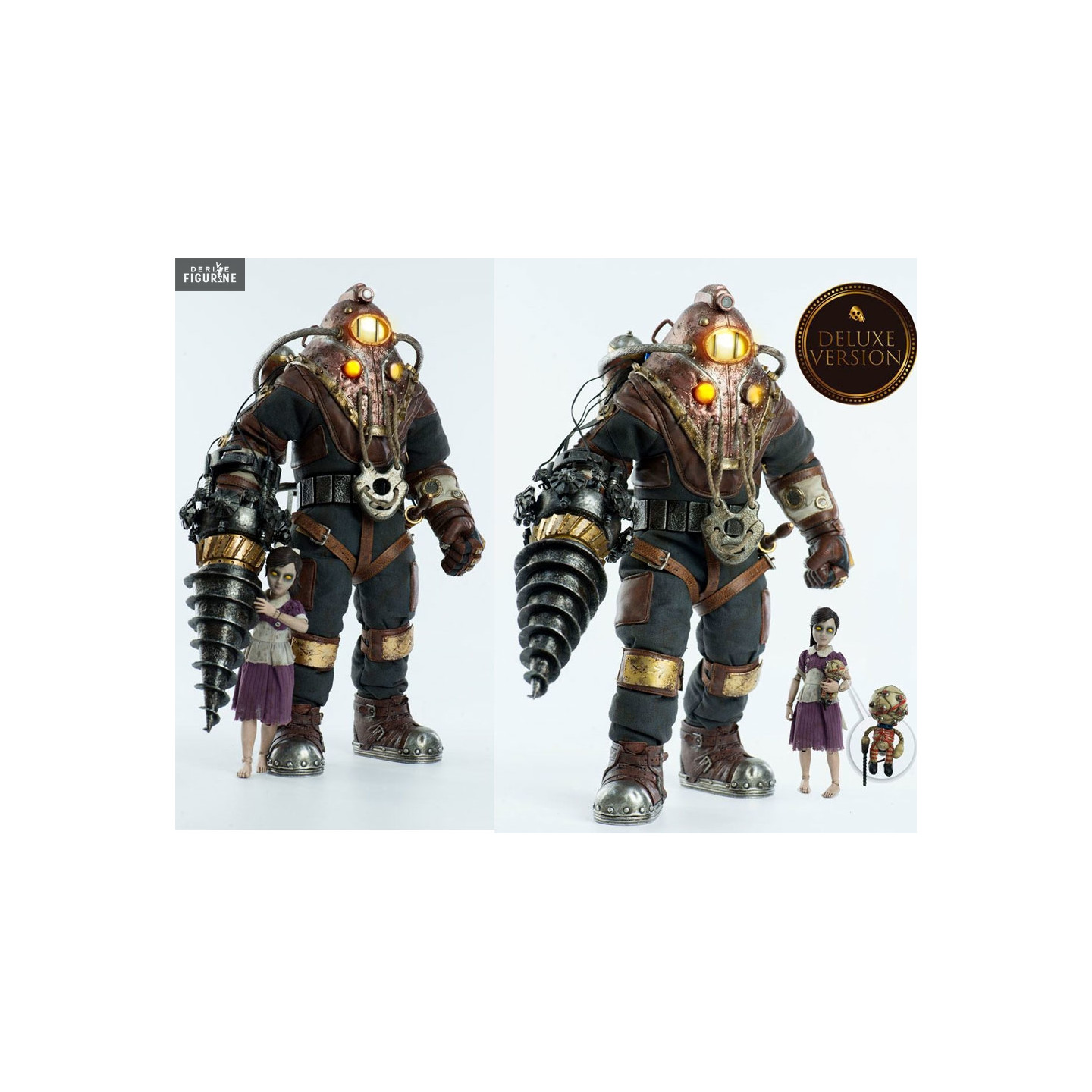 Figurines officielles de Subject Delta et Little Sister mesurant environ 15 et 33 centimètres de haut à l'échelle 1/6. Le fabricant est ThreeZero. Fonctionne avec trois piles AG13 non fournies.