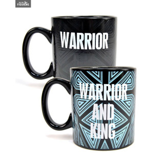 Ce mug possède deux visuels différents. Le premier représente le masque de Black Panther lorsqu'il est froid, tandis que le second se pare d'un design tribal turquoise quand vous versez un liquide chaud dans votre tasse. De plus, à l'arrière les mots "and king" apparaissent en plus de Warrior.