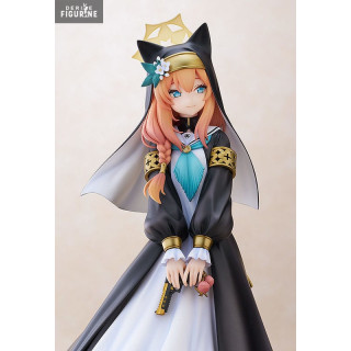 Le halo doré au-dessus de sa tête, composé d'une fleur à six pétales entourée d'un cercle, ajoute une touche céleste à l'ensemble. La représentation artistique de Mari par Miyuki capture parfaitement la personnalité serviable de Mari et son rêve de devenir la meilleure Sœur de Trinity.