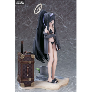 Ui, élève réservée et studieuse de Blue Archive, est ici représentée dans une tenue de plage composée d’un maillot de bain noir sobre, élégamment recouvert d’un gilet ample gris, accentuant son apparence timide et douce. Ses longs cheveux noirs, attachés en partie par un ruban violet, tombent avec grâce jusqu’au sol, tandis qu'une auréole flotte au-dessus de sa tête, une caractéristique emblématique des personnages de Blue Archive. Sa posture légèrement embarrassée, tenant un carnet dans ses mains, illustre parfaitement sa personnalité introvertie et attachante.