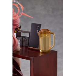 On la voit assise de profil sur un haut siège, le coude posé sur le comptoir et la joue appuyée sur la main, avec un regard posé. Elle porte une robe longue rouge foncé, moulante, avec une fente haute qui découvre largement les jambes, et un pan de tissu qui retombe jusqu’au sol. Ses cheveux roses sont attachés en une longue queue ondulée, avec une mèche qui encadre le visage, et son halo stylisé flotte derrière sa tête. Le décor intègre un comptoir aux tons boisés, un pied métallique, un petit présentoir type menu et une bouteille, le tout sur une base carrée carrelée qui donne un vrai effet “scène” facile à exposer.