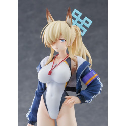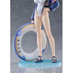 Visuellement, elle a de longs cheveux blonds attachés en queue de cheval sur le côté, avec des oreilles animales dressées au-dessus de la tête. Elle porte un maillot une pièce blanc avec des panneaux gris et un détail rouge au niveau de l’encolure, plus une veste bleue portée ouverte et tombant sur les épaules, avec une bande jaune sur le haut du bras. Elle est en sandales bleues et se tient à côté d’une grande bouée bleu/blanc avec un intérieur jaune, marquée “K.S.P.D”. Le tout repose sur une base ronde bleutée façon surface d’eau, avec un élément graphique bleu derrière elle ; l’ensemble se pose facilement et donne une scène bien lisible en vitrine.