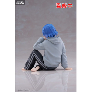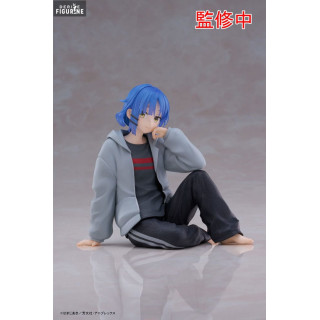 La figurine représente Ryo Yamada dans une pose assise, habillée d'une tenue confortable et décontractée. Elle porte un sweat à capuche gris par-dessus un t-shirt rayé, ainsi qu'un pantalon de survêtement noir, parfaits pour un moment de détente à la maison. Les détails de ses vêtements sont minutieusement sculptés, mettant en avant les textures et les plis du tissu, créant une apparence réaliste et attrayante.