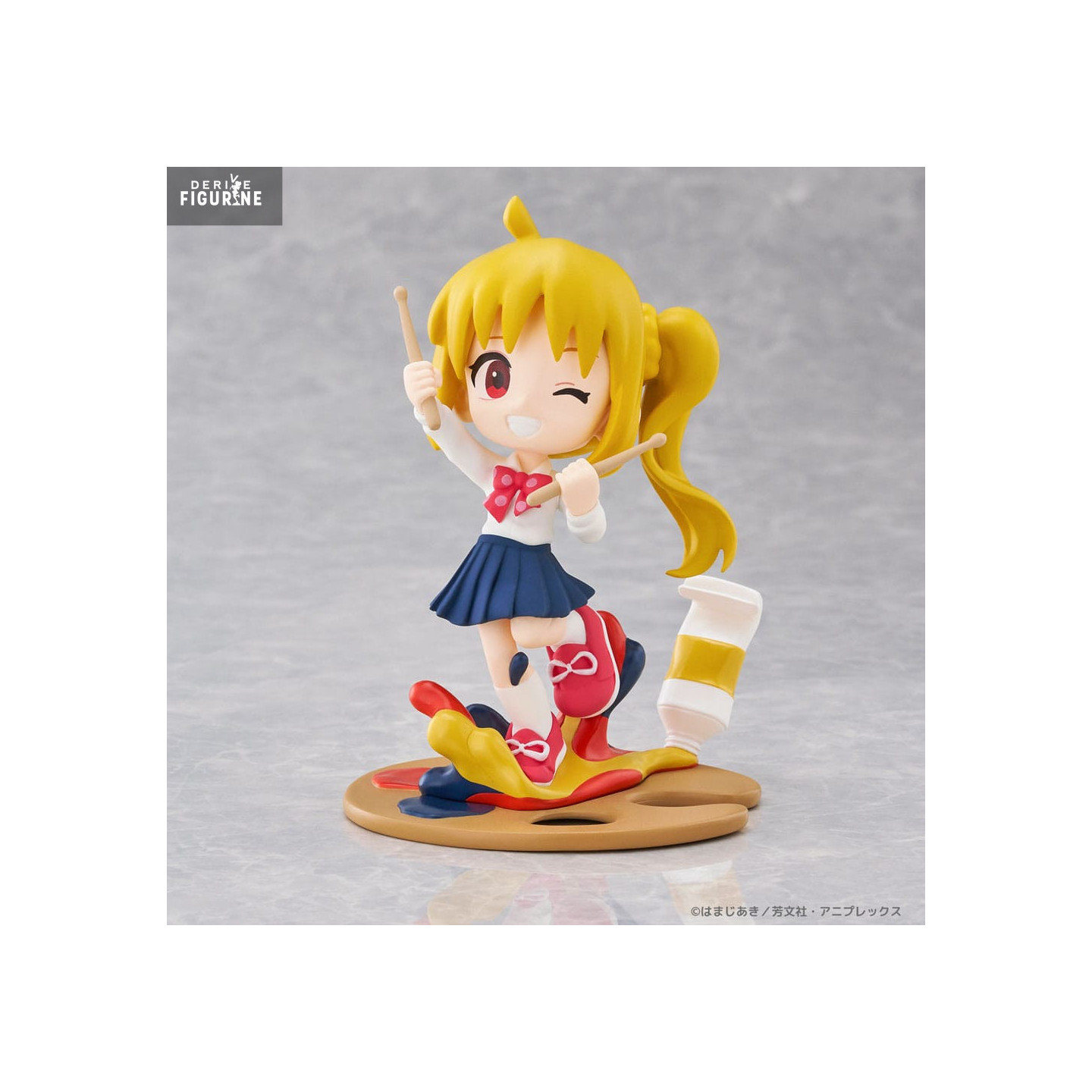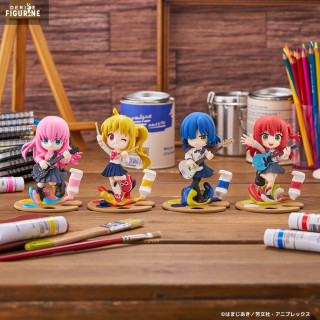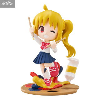 La figurine de Nijika capture parfaitement son caractère espiègle et plein de vie. Sa posture dynamique, avec ses baguettes de batterie en main, montre qu'elle est prête à jouer, tandis que son sourire radieux et son clin d'œil reflètent son attitude optimiste et motivante. La tenue de Nijika, fidèle à l'anime, est reproduite avec soin, de son uniforme scolaire à ses chaussures rouges. Le socle de la figurine, parsemé de peinture éclaboussée, ajoute une touche artistique qui reflète l'esprit créatif de la série.