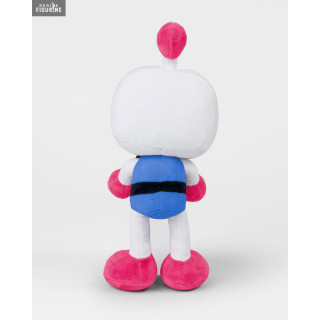 Peluche officielle de Bomberman mesurant environ 37 centimètres de haut. Le fabricant est ItemLab.