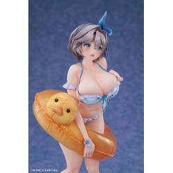En observant la figurine de près, on remarque d’abord ses cheveux gris courts, coiffés avec un grand nœud bleu sur le dessus de la tête, et quelques mèches qui encadrent son visage aux yeux bleus. Teresse porte un bikini bleu clair décoré de petits volants, le haut noué au centre avec un ruban et le bas ajusté sous la bouée gonflable en forme de canard jaune translucide orangé. Un bracelet-montre bleu à son poignet gauche, des sandales à talons ouvertes avec lacets bleus enroulés autour des chevilles et un vernis discret sur les ongles complètent son look de plage. La base façon banc de sable, légèrement texturée, assure une bonne stabilité et renforce la sensation de scène estivale prête à être exposée sur une étagère.