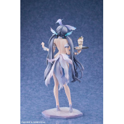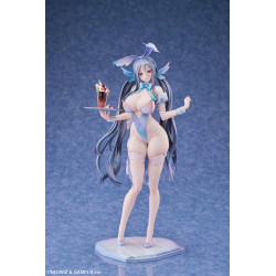 Dès qu’on pose les yeux sur Morpeah Daydream Bunny, on a l’impression d’entrer dans un salon onirique où une serveuse venue d’un autre monde t’apporte un dessert bien trop raffiné pour être réel. Cette figurine officielle en PVC mesure environ 28 cm de haut, à l’échelle 1/7, et est produite par Hobby Sakura. Morpeah est installée sur une base géométrique dans des tons blancs et bleutés, debout avec assurance, un plateau à la main et un sourire tranquille qui colle parfaitement à son nom de “Daydream Bunny”.