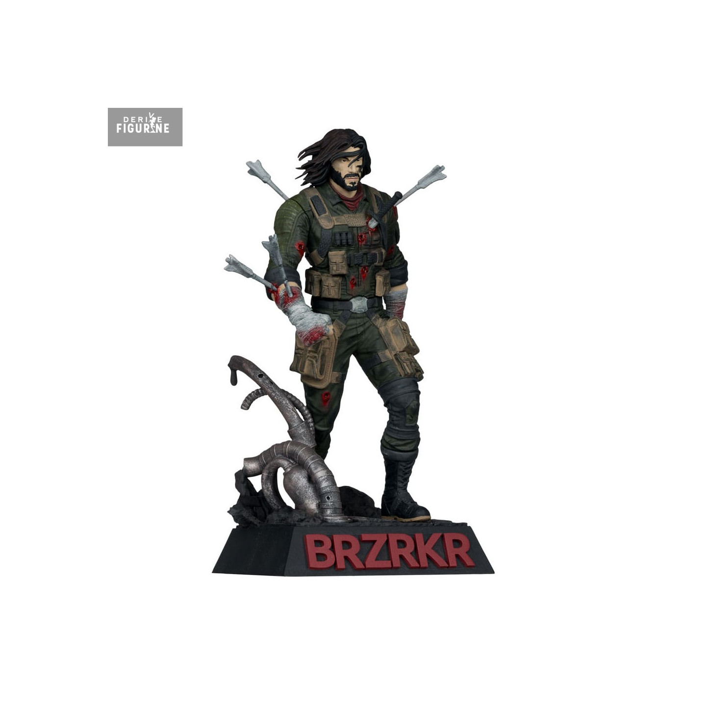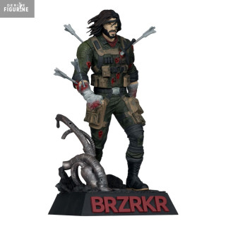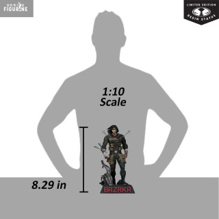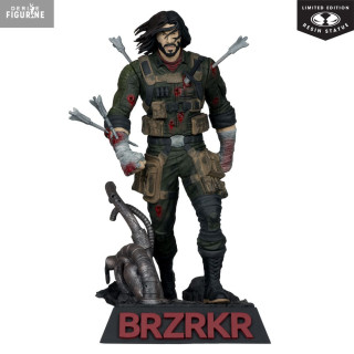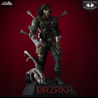 Conçue en résine haute densité, cette figurine de 21 cm (échelle 1/10) se distingue par la précision de ses détails : texture du tissu froissé, gravure fine des bandages et finition peinture mate agrémentée d’éclaboussures réalistes de sang. Le socle, orné du logo « BRZRKR » en relief rouge, complète l’ensemble avec une touche spectaculaire.