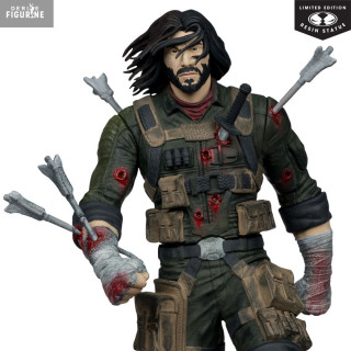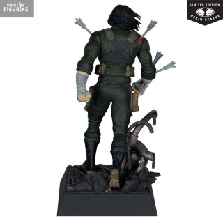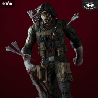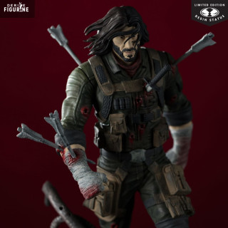 Le design de cette Limited Edition en résine capture un instantané de sa lutte : vêtu d’un treillis kaki usé, gilet tactique bardé de poches et bandages ensanglantés, il pose un pied sur un socle criblé de tentacules métalliques. Quatre flèches plantées dans son torse et son bras témoignent de sa résilience inébranlable. Sa barbe de quelques jours, ses cheveux emmêlés et son regard déterminé reflètent parfaitement son caractère indomptable.