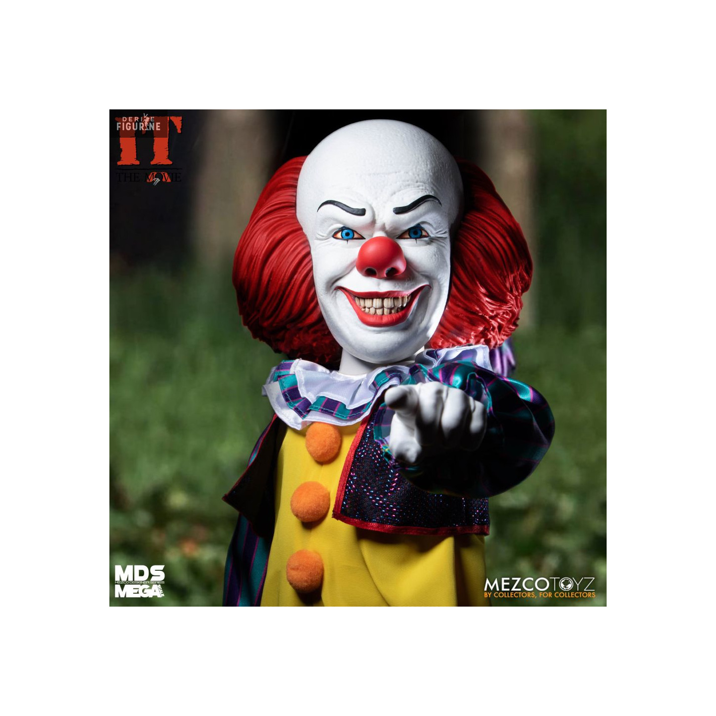Figurine officielle de Pennywise en PVC/tissu mesurant environ 37 centimètres de haut. Elle est issue de la collection Mezco Designer Series (MDS) Mega Scale. Le fabricant est Mezco Toys.