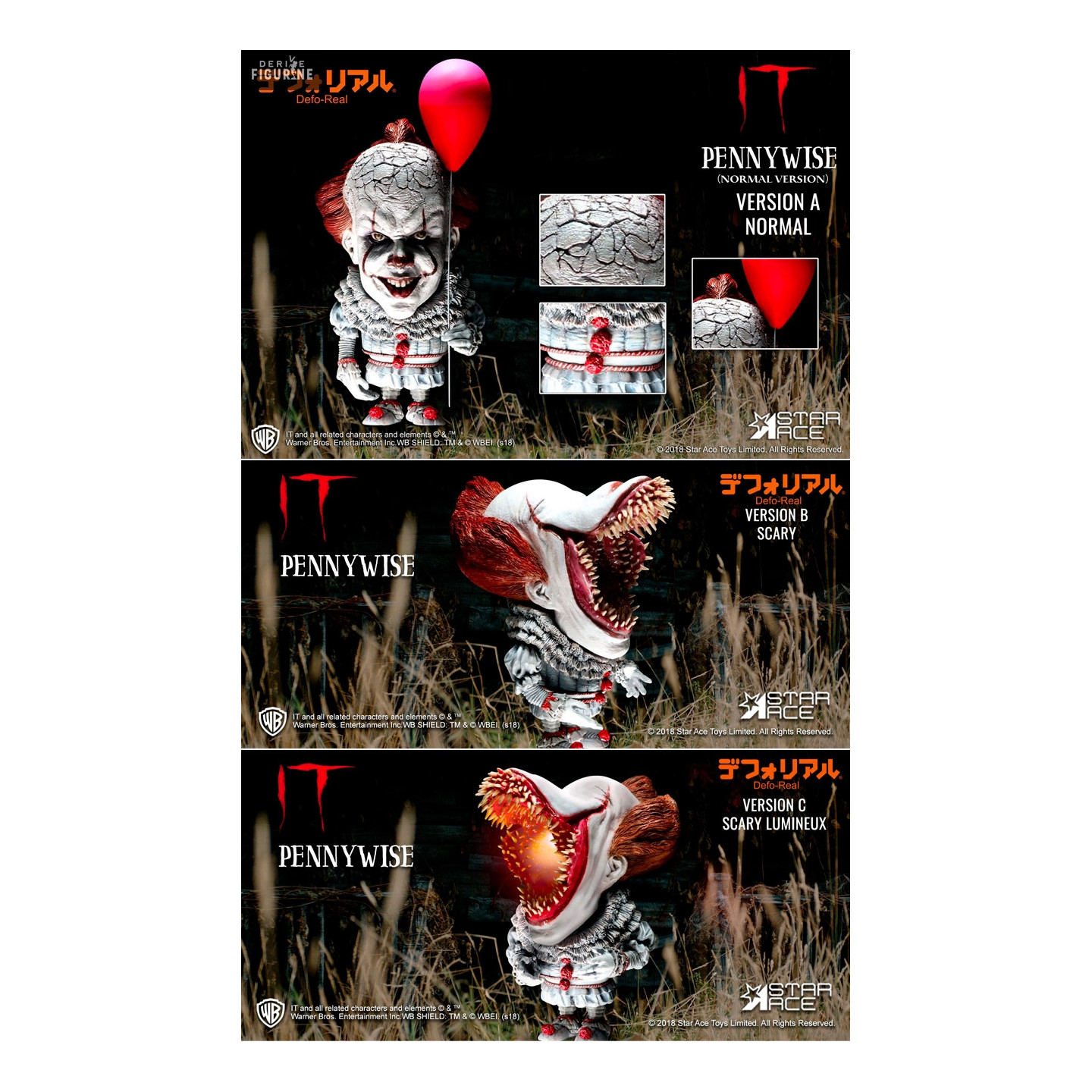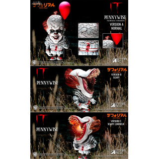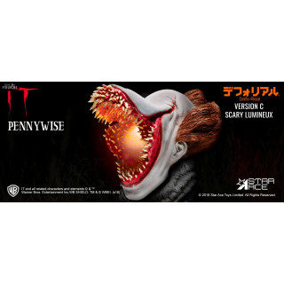 Figurine officielle en vinyle de Pennywise normal (A), Scary (B) ou Scary lumineux (C), Defo-Real (infos en description) d'environ 15 centimètres de haut. Elle est fabriquée par Star Ace.