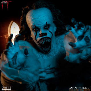 Figurine officielle de Pennywise mesurant environ 17 centimètres de haut, à l'échelle 1/12. Le fabricant est Mezco Toys.