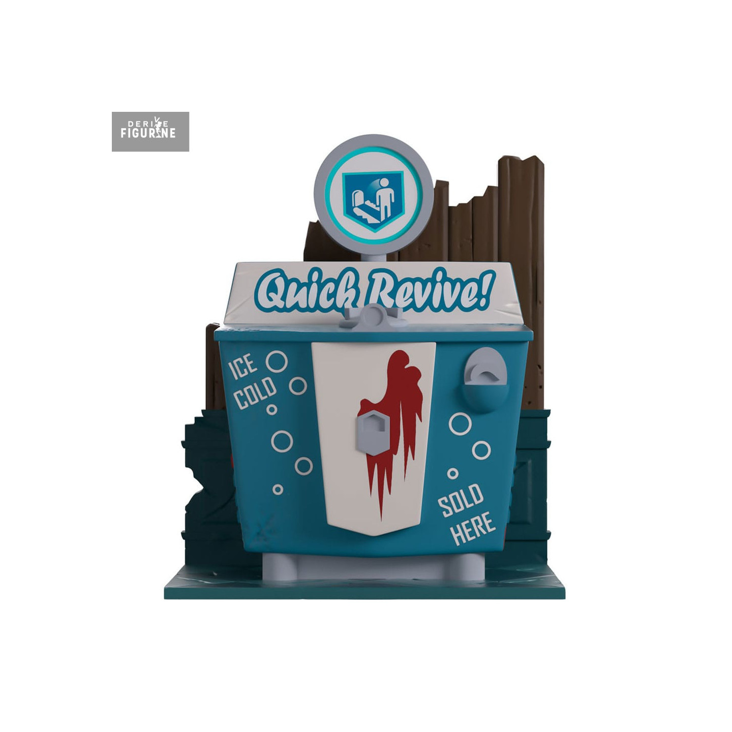 La machine est représentée dans son coloris bleu clair caractéristique, avec son logo circulaire sur le dessus et l’inscription “Quick Revive!” en façade. Les détails moulés incluent la poignée de distribution, le monnayeur, ainsi que les inscriptions “Ice Cold” et “Sold Here” sur les côtés. La base rappelle un environnement en bois usé, fidèle à son apparence dans le jeu.