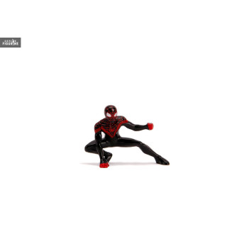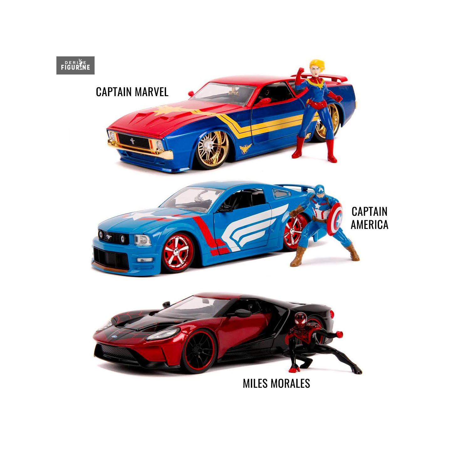 Figurines officielles + véhicule au choix entre Captain Marvel, Captain America ou Miles Morales en die cast et plastique injecté, à l'échelle 1/24. Le fabricant est Jada Toys.