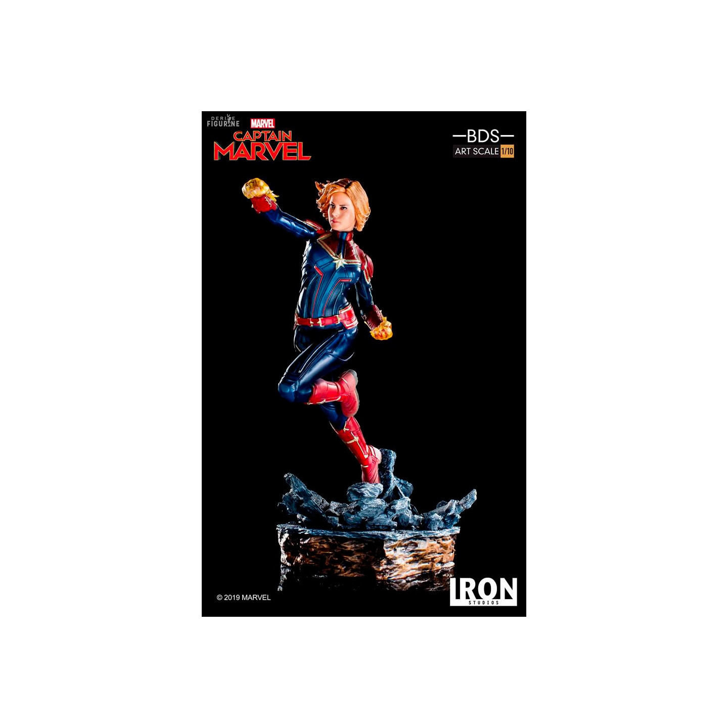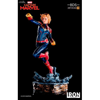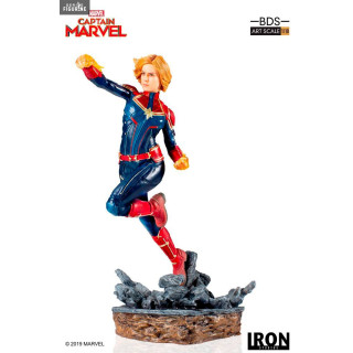 Figurine officielle de Captain Marvel en résine mesurant environ 20x12x18 centimètres, à l'échelle 1/10. Elle est issue de la collection BDS Art Scale. Le fabricant est Iron Studios.
