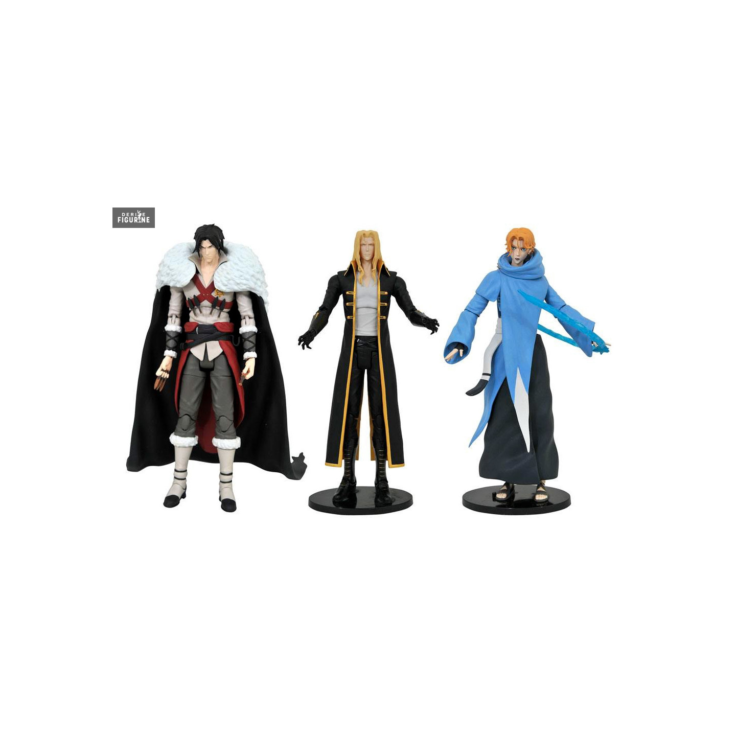 Trois personnages emblématiques de Castlevania sont réunis dans un pack de figurines. Dans un premier temps nous avons Sypha Belnades, la sorcière, puis Adrian Fahrenheit Tepes plus connu sous le nom d'Alucard, et enfin Trevor Belmont. Vous pouvez aussi retrouver nos trois acolytes dans l'anime disponible sur Netflix.