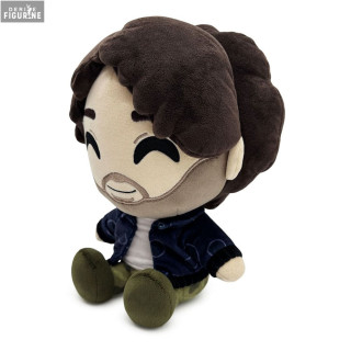 Cette peluche officielle restitue chaque détail de son look casual : une veste bleu marine rehaussée de motifs cerclés, un t-shirt blanc simple et un pantalon à imprimé camouflage vert kaki. Les mèches sculptées de sa chevelure bouclée, la barbe finement brodée et son sourire apaisé traduisent son caractère accessible et passionné, loin des clichés de rock star.