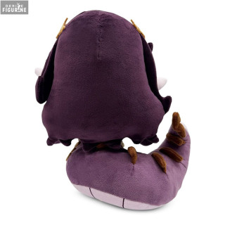 Le design reprend fidèlement son apparence : une longue chevelure violette aux mèches volumineuses, encadrée par deux grandes oreilles pointues. Sa tête est ornée d’une couronne dorée décorée d’un bijou turquoise central, tandis que ses yeux jaunes, soulignés de marques sombres, expriment un mélange d’assurance et de malice. Son corps serpentin violet est orné de motifs dorés et de détails brodés qui rappellent son costume d’origine.