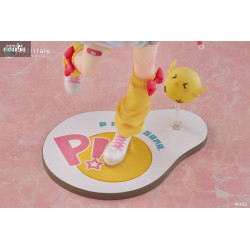 Les détails sont nombreux : pansement sur le genou, petits objets accrochés à la veste, mascotte volante maintenue par une tige transparente, et socle décoré de son logo. La sculpture donne du volume à chaque partie de la tenue, et les finitions pastel créent une belle harmonie visuelle.