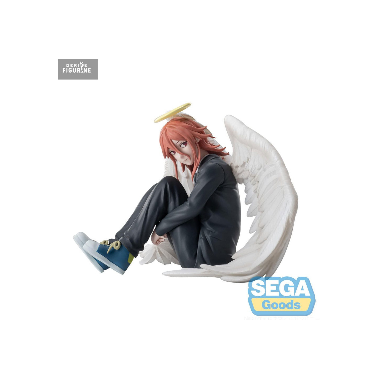 Assis, jambes repliées contre lui-même, Angel Devil détourne légèrement le regard avec une expression à la fois lasse et absente. Son auréole flottant au-dessus de sa tête, ses longues ailes blanches déployées et ses cheveux roux retombant en mèches souples renforcent l’esthétique éthérée et fragile du personnage.