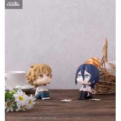 Denji, jeune homme à la vie tourmentée, affiche ici un large sourire carnassier et une posture assise pleine d’entrain. Reze, quant à elle, dévoile un regard malicieux sous sa mèche noire et une posture tranquille, jambes repliées sous elle. Le duo, stylisé en version chibi, reflète une complicité silencieuse dans un style tout en rondeur.