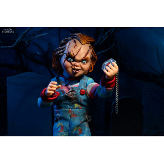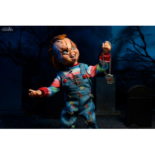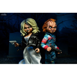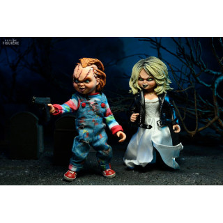 Figurines officielles de Chucky et Tiffany mesurant environ 14 centimètres de haut. Le fabricant est NECA.