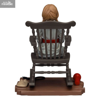 La figurine la représente assise sur son rocking-chair en bois usé, vêtue de sa robe blanche à col volanté et de son ruban rouge orné d’une rose. Sur la base en faux parquet, on retrouve les accessoires emblématiques : le collier de perles brisé, le gobelet renversé et le mouchoir taché, éléments témoins des rituels occultes. Les détails – plis de la robe, texture du bois, regard bleu vitreux – sont finement travaillés pour restituer l’ambiance angoissante du film.