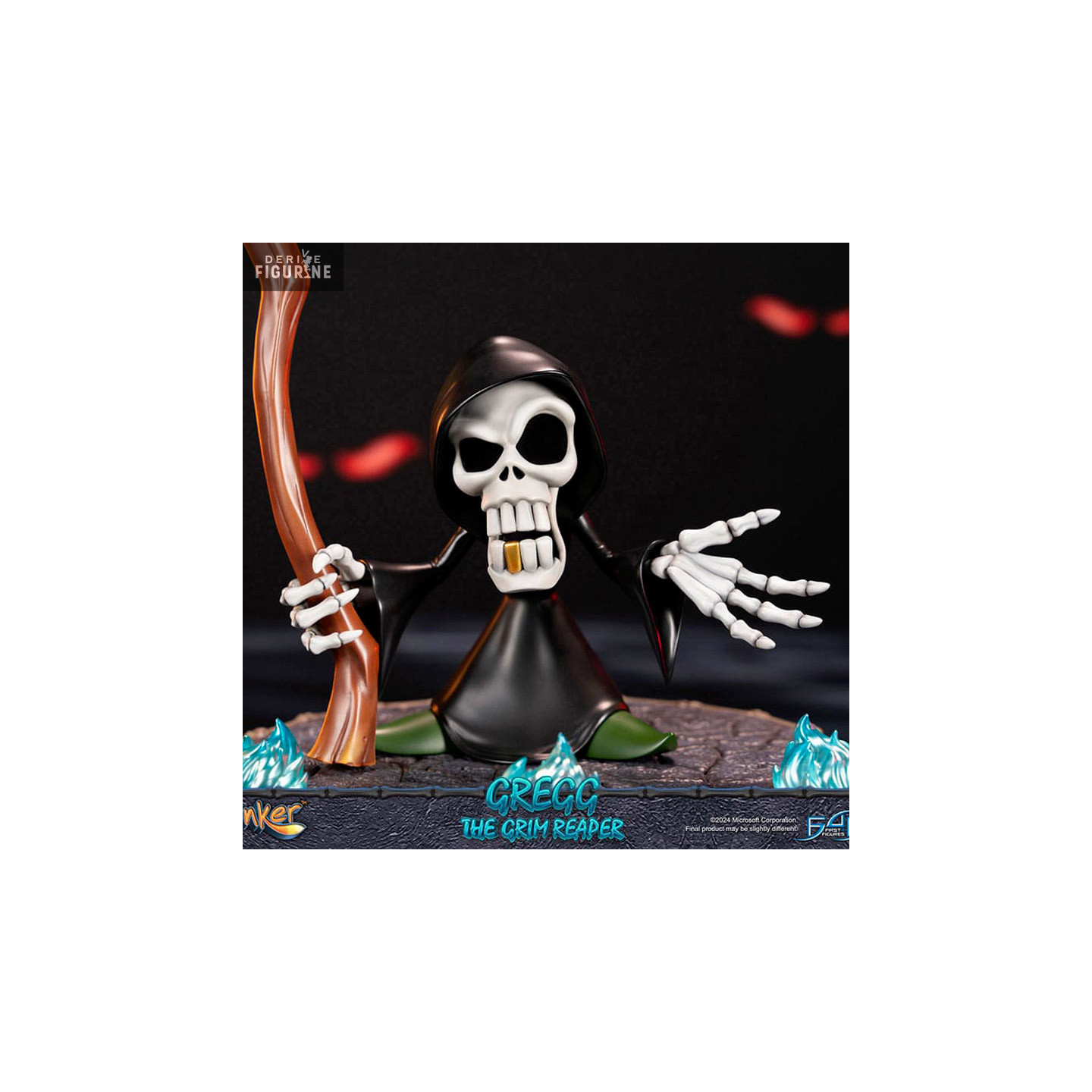 Gregg the Grim Reaper, vêtu de sa robe noire et brandissant sa faux, est superbement représenté dans une pose dynamique, prêt à guider Conker dans l'au-delà. Les détails minutieux, tels que les ombrages sur la robe et l'expression faciale malicieuse, capturent parfaitement l'esthétique unique du jeu.