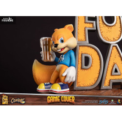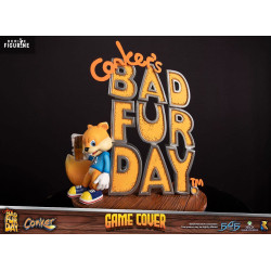 Cette figurine en résine rend hommage à la jaquette emblématique du jeu. Conker y trône avec son verre de bière à la main, adossé au gigantesque logo « BAD FUR DAY » texturé façon fourrure et métal usé. Le socle imite un plancher de bois de bar, renforçant le ton décalé et festif du personnage.