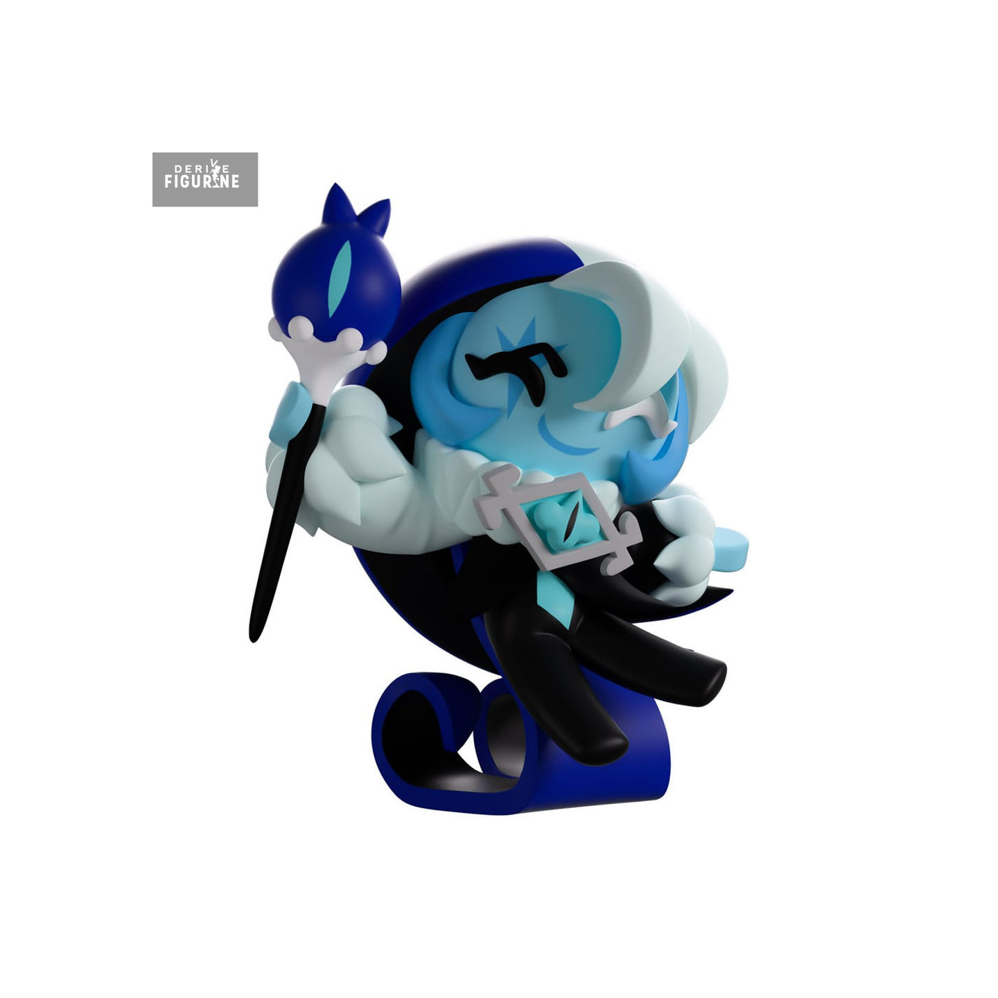 La figurine représente Shadow Milk Cookie dans une pose dynamique, brandissant un sceptre surmonté d’un orbe bleu. Sa chevelure blanche et bleu clair, sculptée en mèches ondulées, encadre un visage affichant un sourire assuré et des yeux mi-clos. Sa cape bleu nuit, stylisée en courbes fluides, souligne le mouvement et apporte du volume à la silhouette.