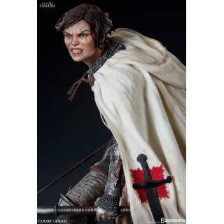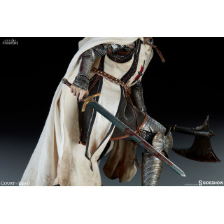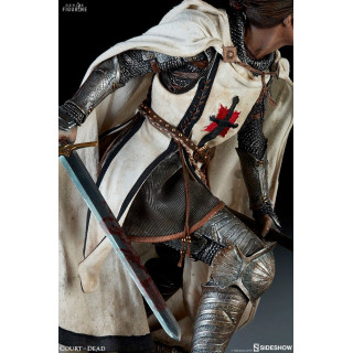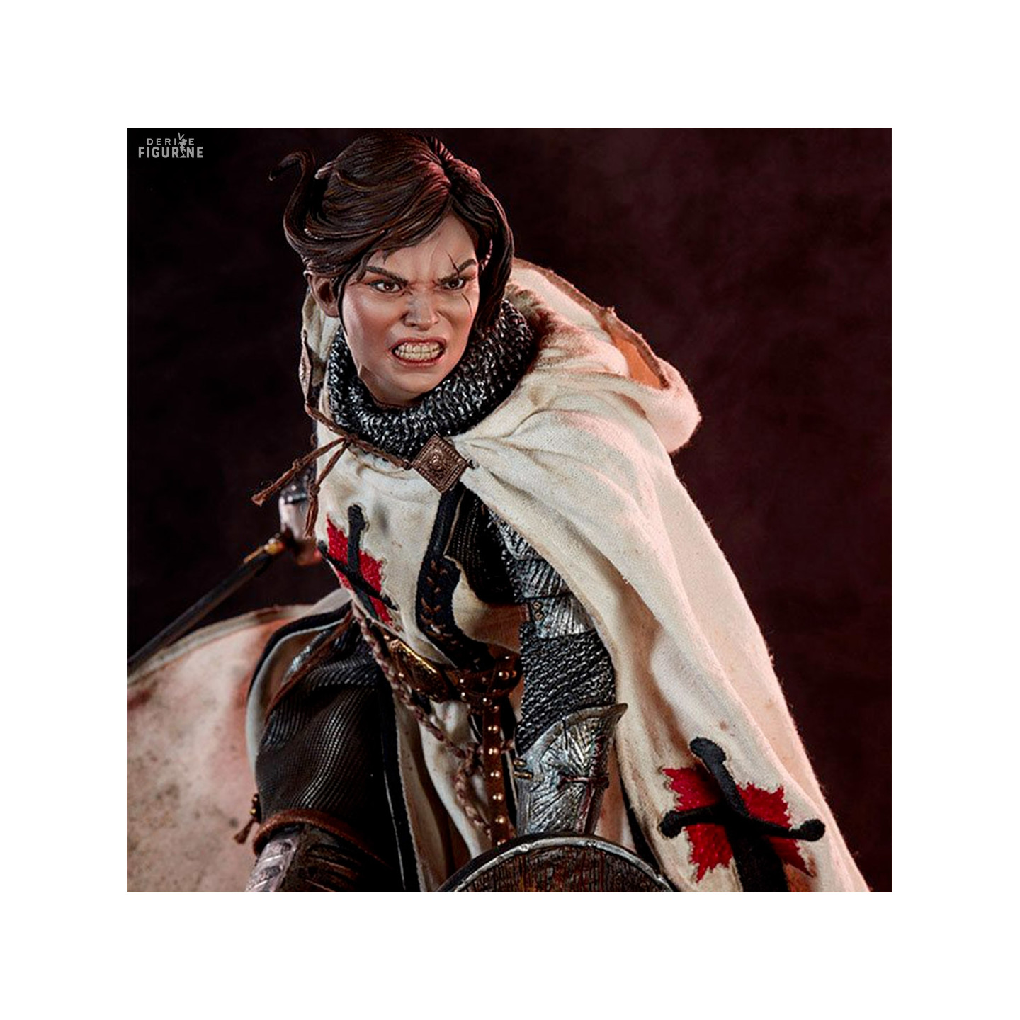 La femme que vous avez en face de vous est une guerrière qui est grandement inspirée des Templiers. Elle porte une longue cape blanche, tient une épée dans une main et soit une hache soit un bouclier endommagé de l'autre. Les détails sont vraiment bluffant et le rendu est très réaliste.