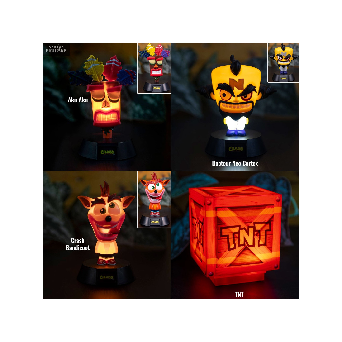Veilleuse officielle au choix entre Crash Bandicoot, Docteur Neo Cortex, Aku Aku ou une caisse de TNT mesurant environ 10 centimètres de haut. Le fabricant est Paladone.