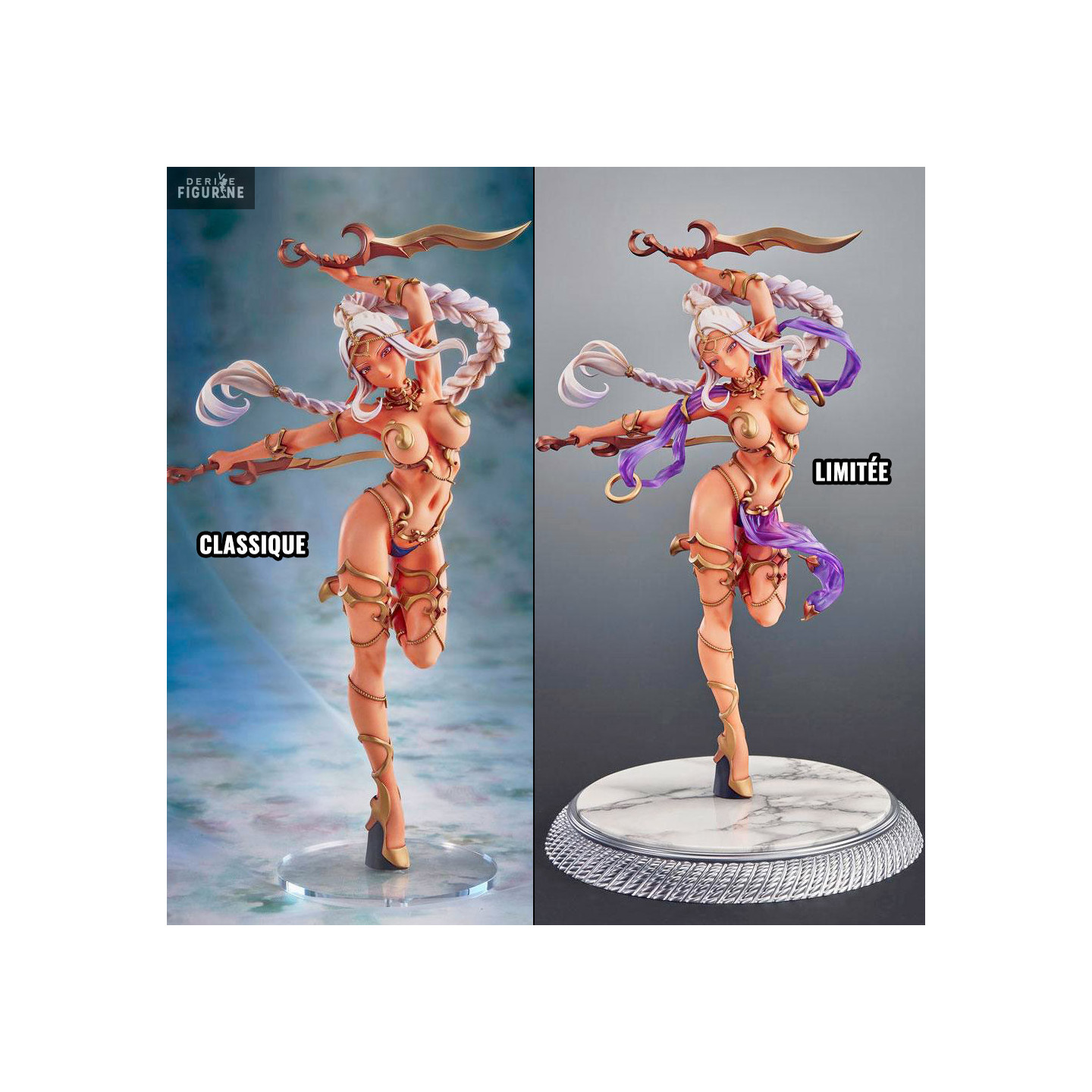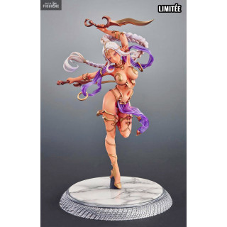 La jeune femme que vous avez sous les yeux est vraiment très jolie et certainement la première d'une série d'elfe noirs. Sa tenue est très sexy avec la possibilité de lui retirer le fouloir violet autour de son corps. En plus, vous avez le choix entre la version Classique ou la Limitée qui possède en plus un très joli socle décor imitation marbre.